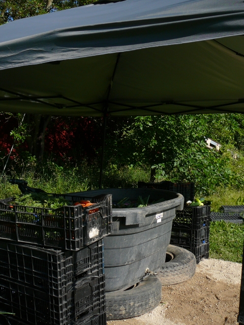 Our dry spell has broken, and so has the heat! We were getting pretty tired of running the irrigation day and night, so we welcomed the storms that blew through Harvard last night and the night before. It was a bit of a rush to get things harvested and washed last night before the rain started, but we managed to get everything under cover before the wind really picked up. Ray was very helpful and honked the truck horn many times as we gathered tomatoes.